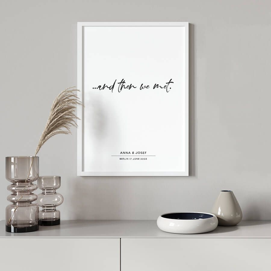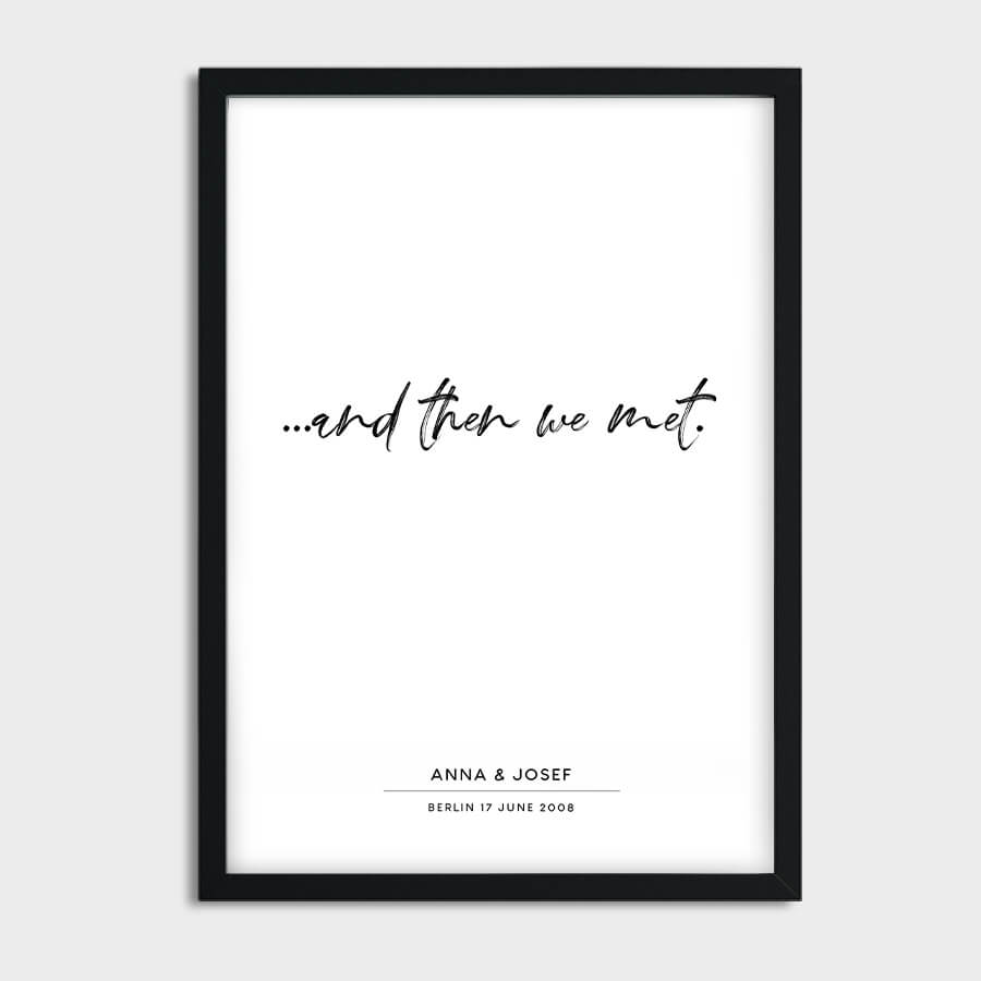Das "And then we met Poster" von at9pm ist ein exquisiter Ausdruck zeitgemäßer Ästhetik und feiner Typografie. Mit seiner klaren, minimalistischen Gestaltung und einem modernen Layout fügt sich dieses personalisierte Kunstwerk nahtlos in jedes Interieur ein. Die zurückhaltende Eleganz des Designs wird durch die Verwendung von hochwertigem, mattem Premiumpapier verstärkt, das sowohl visuelle als auch taktile Ansprüche erfüllt.