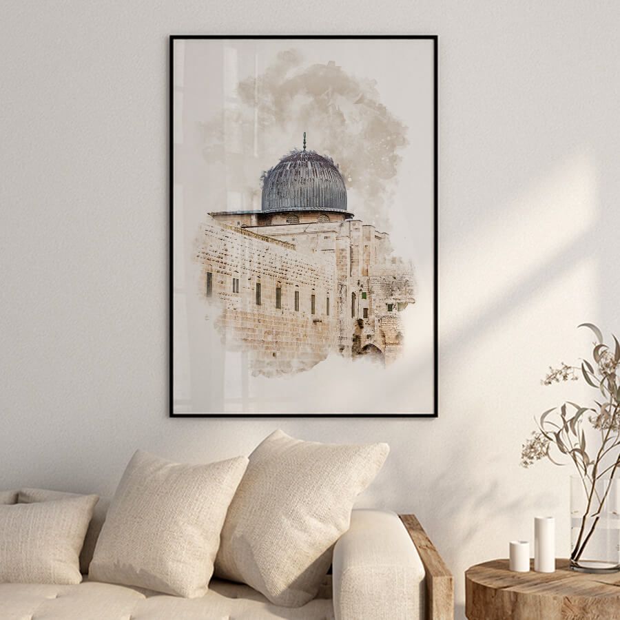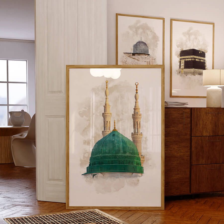 Entdecken Sie die ruhige Schönheit des Islams mit unserem exquisiten Aqsa, Kaaba, Nabawi Watercolor Poster Set von at9pm. Jedes Kunstwerk ist ein Meisterwerk, das die architektonische Pracht und Spiritualität der heiligen Stätten in einem harmonischen Wasserfarbdesign einfängt.