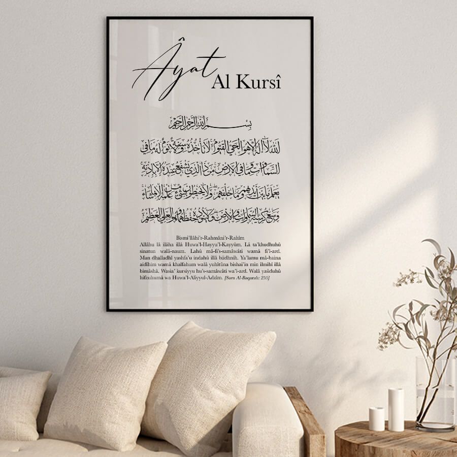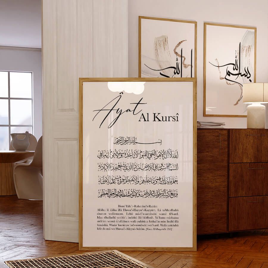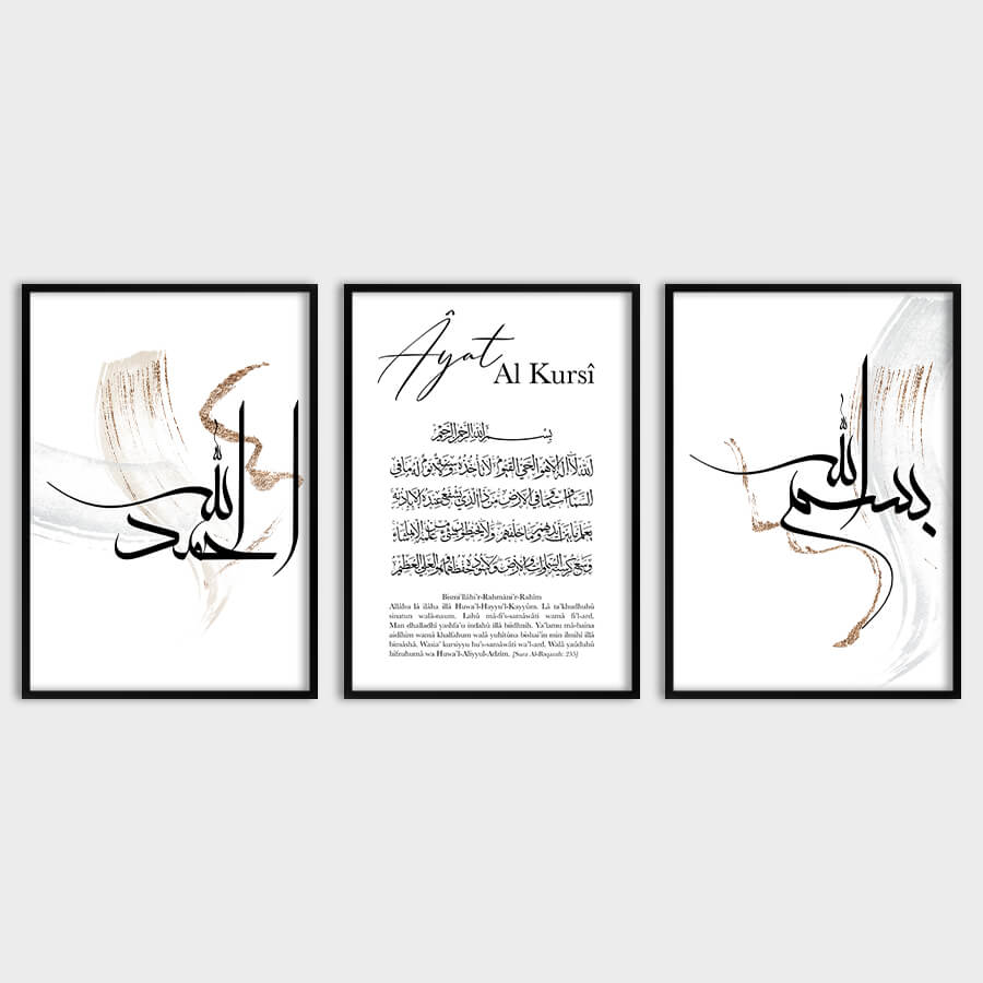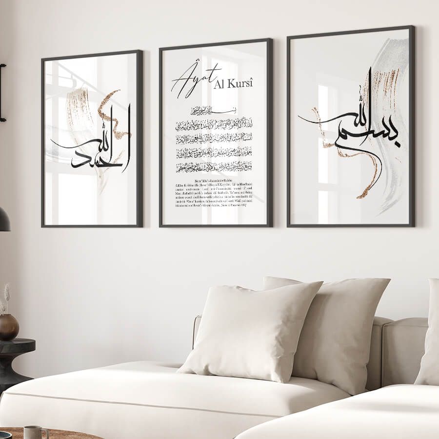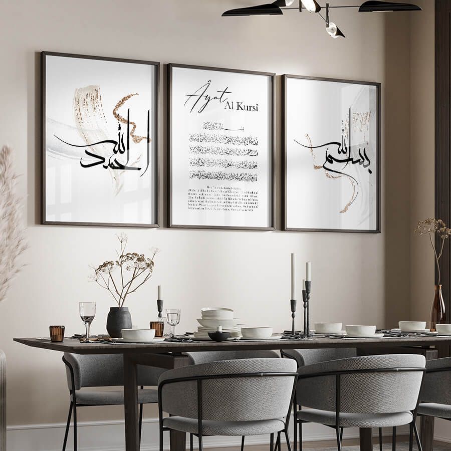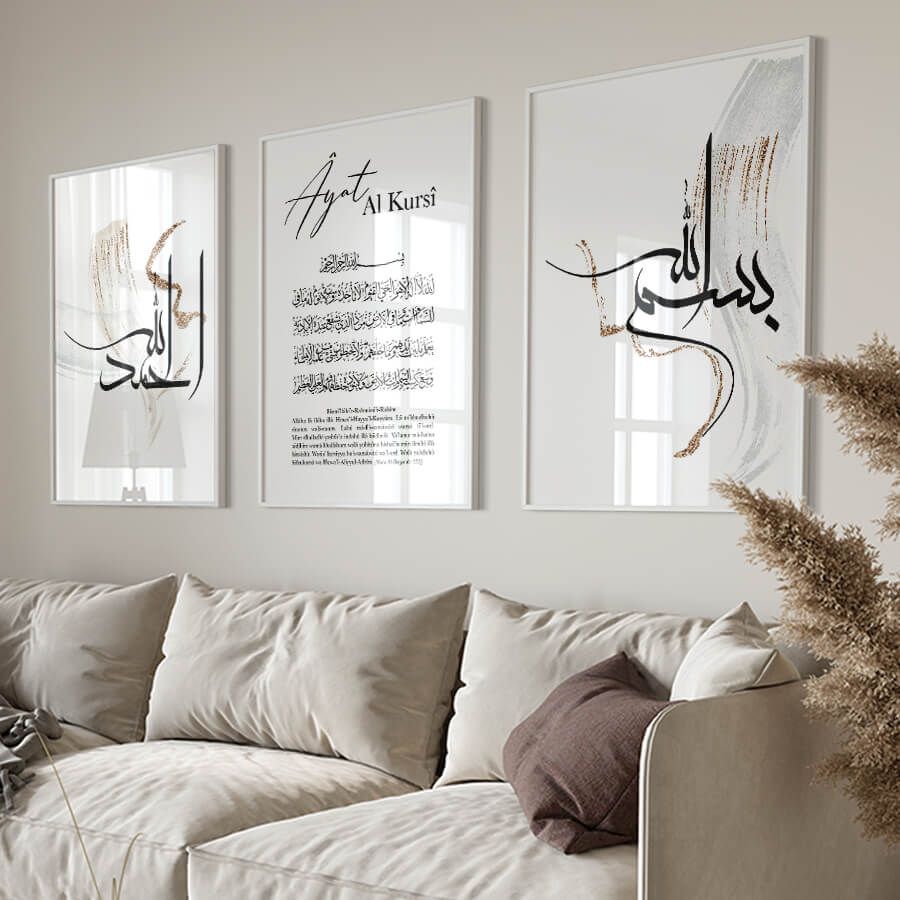 Die Kunst des Islams erfährt mit unserem Bismillah, Ayat Al Kursi und Alhamdulillah Poster Set eine elegante und zeitlose Darstellung. Jedes Stück dieser Kollektion ist sorgfältig gestaltet, um die tiefen spirituellen Werte, die sie verkörpern, auf harmonische und ästhetische Weise zu vermitteln.