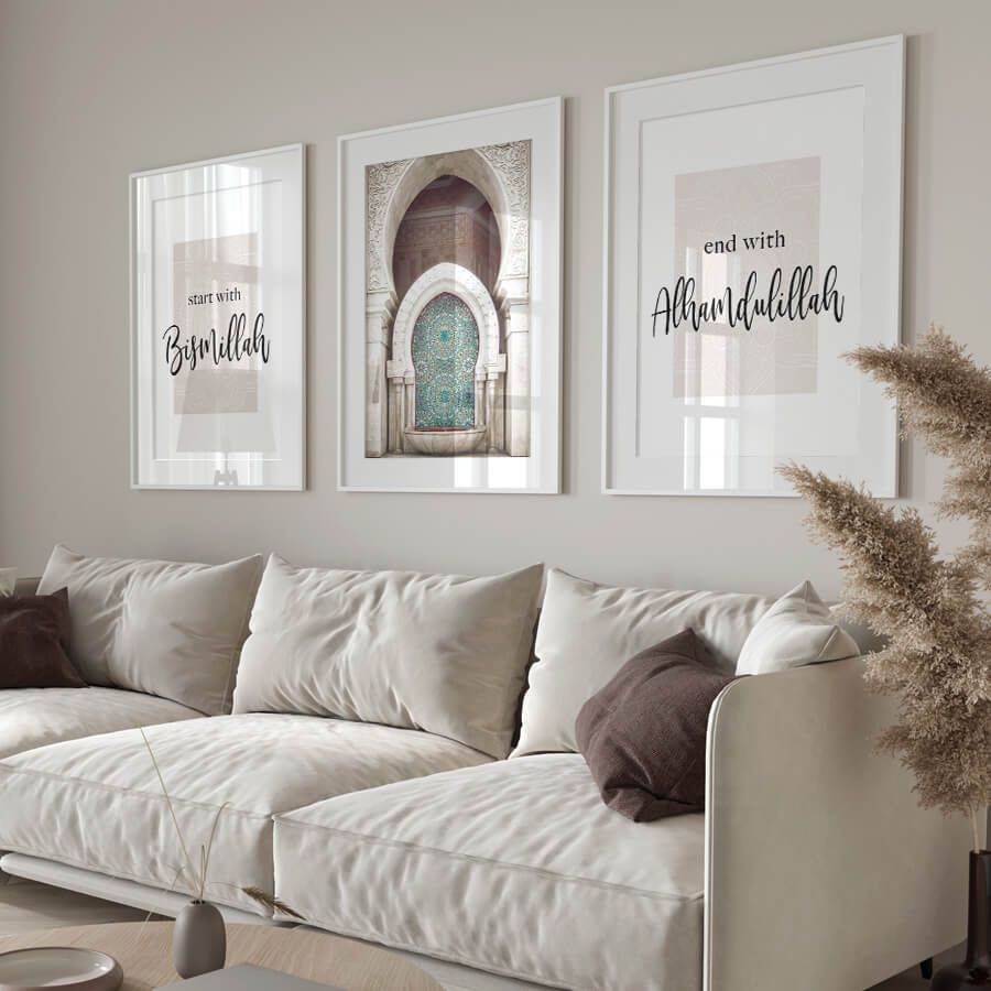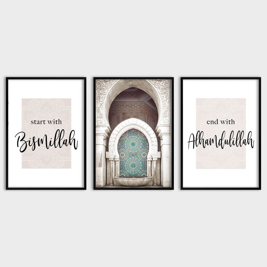Das Bismillah, Mosaikbrunnen, Alhamdulillah Poster Set von at9pm verkörpert eine harmonische Verbindung von Kunst und Spiritualität. Dieses exklusive Set ist nicht nur ein Stück arabischer Kalligrafie, sondern ein kunstvolles Designobjekt, das Ihre Räume mit einem Gefühl der Ruhe und des inneren Friedens erfüllt.