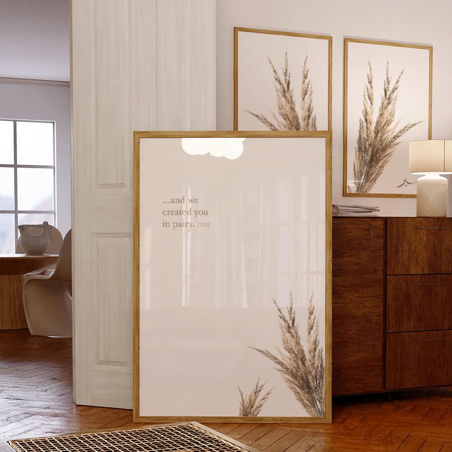 Geeignet für jeden Raum, von der Meditationsnische bis hin zum privaten Büro, fügt sich der „Created in Pairs 78:8“ Poster-Set nahtlos in moderne und klassische Inneneinrichtungen ein und hebt diese auf ein neues Niveau der Eleganz und des Geistes.