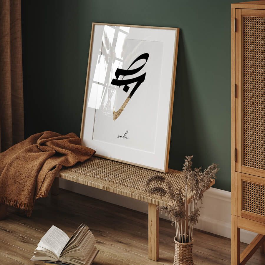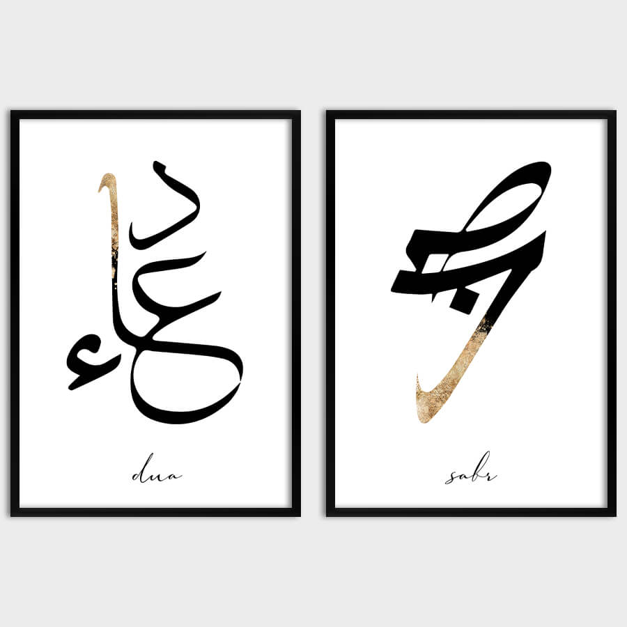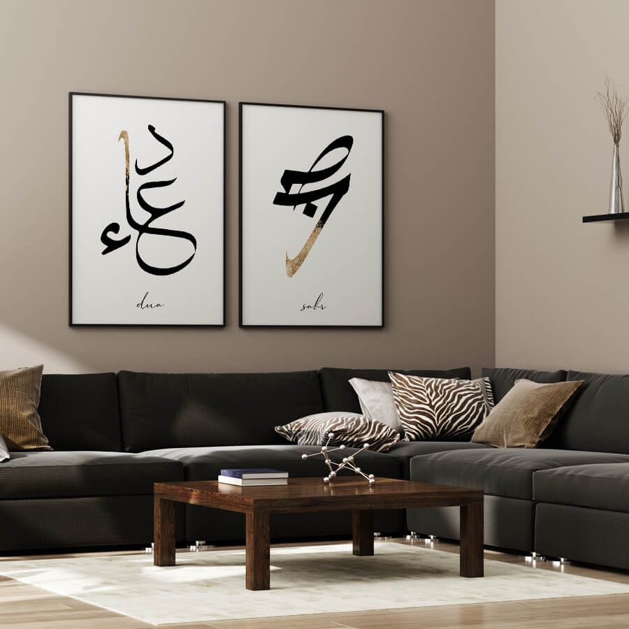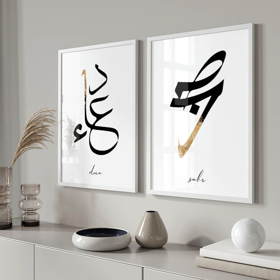 „Dua“, das auf Arabisch „Bitte“ oder „Anruf“ bedeutet, verkörpert die Kraft des Gebets und die intime Verbindung zu Allah. „Sabr“, was so viel wie „Geduld“ bedeutet, erinnert uns an die Stärke und Ausdauer, die jeder Mensch im Leben erfordert. Zusammen bilden sie eine harmonische Botschaft, die nicht nur das Design bewusst gestalteter Räume bereichert, sondern auch eine tiefere Bedeutung transportiert.