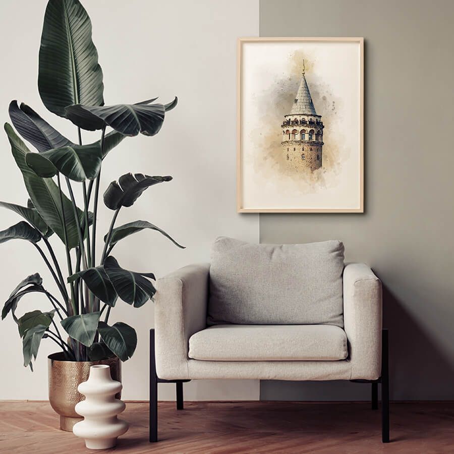 Der Galataturm, mit seiner ikonischen Silhouette, erhebt sich majestätisch über die Stadt und strahlt ein Gefühl von urbaner Raffinesse aus. Die sanften Wasserfarben verleihen dem Kunstwerk eine besondere Tiefe, während Lichtspiele und Texturen die Symmetrie und die architektonische Pracht des Turms unterstreichen. Jedes Detail wird auf elegante Weise hervorgehoben und schafft so eine einladende Atmosphäre in Ihrem Zuhause.