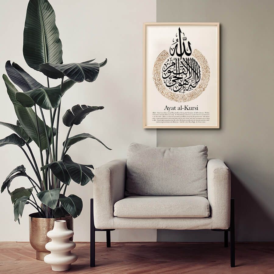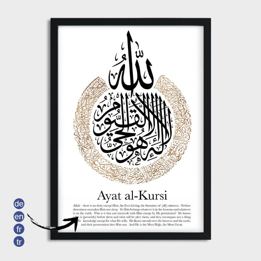 „Ayat Al Kursi“ (آية الكرسي) bedeutet „Die Vers der Throne“ und ist ein kraftvoller Vers aus dem Heiligen Quran, der Schutz und Sicherheit vermittelt. Es wird oft rezitiert, um Trost und Stärke zu finden.