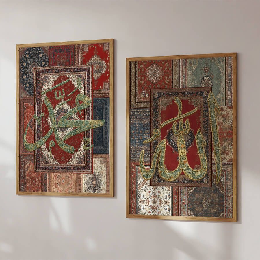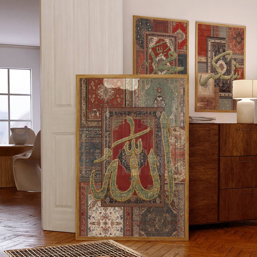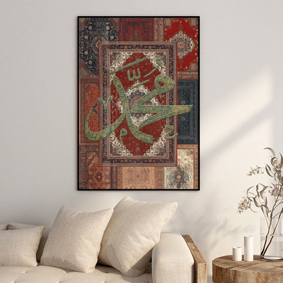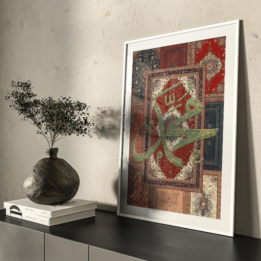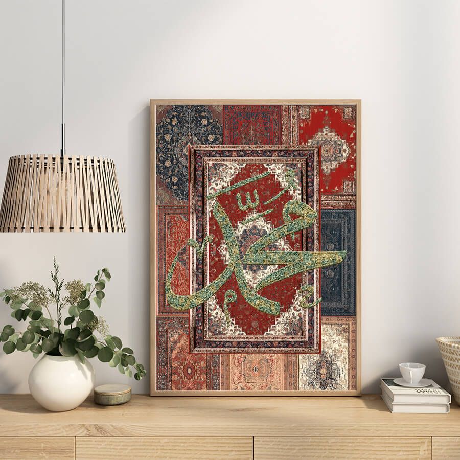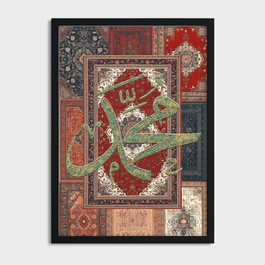 Erleben Sie die zeitlose Schönheit und spirituelle Tiefe mit unserem exklusiven Poster, das die noble Schrift des Propheten Muhammad ﷺ in einem eleganten Teppich-Stil präsentiert. Dieses Kunstwerk ist nicht nur ein visuelles Highlight, sondern verkörpert auch die Essenz der islamischen Kultur und Tradition.