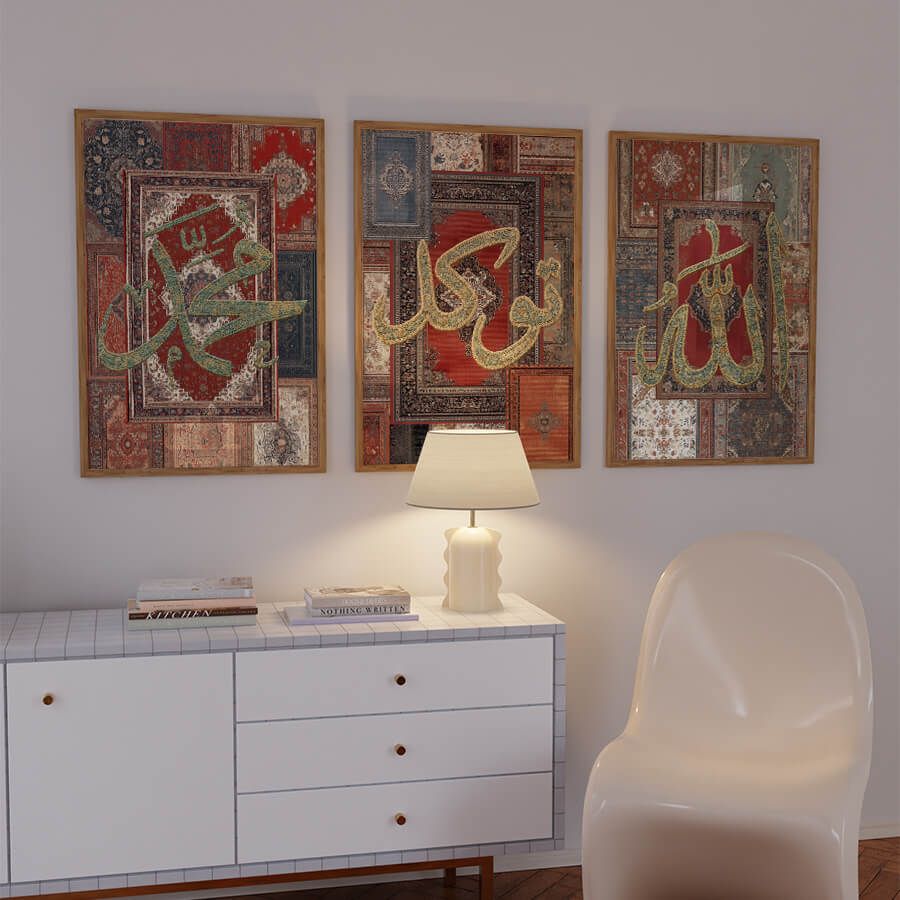 Die Kombination aus traditioneller Kalligraphie und einem Teppich-Stil verleiht diesem Poster eine besondere Anmut und erinnert an die reichen Traditionen des islamischen Kunsthandwerks. Es ist nicht einfach nur Wanddekoration, sondern eine Einladung zur Besinnung und Wertschätzung der spirituellen Reise.