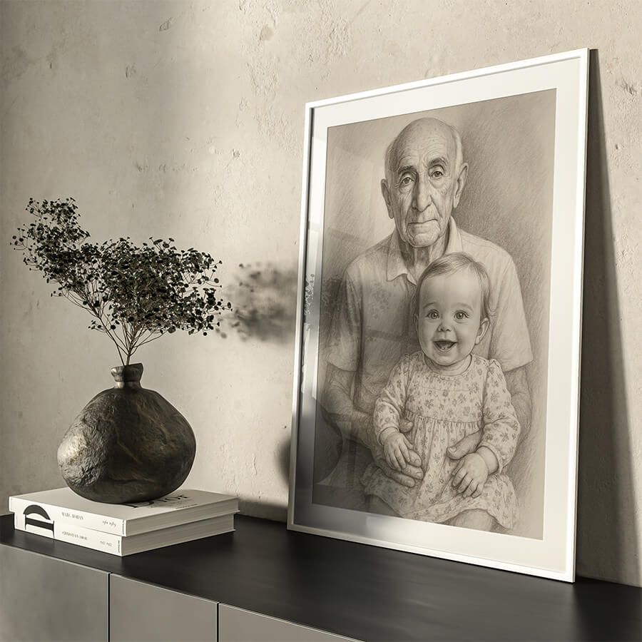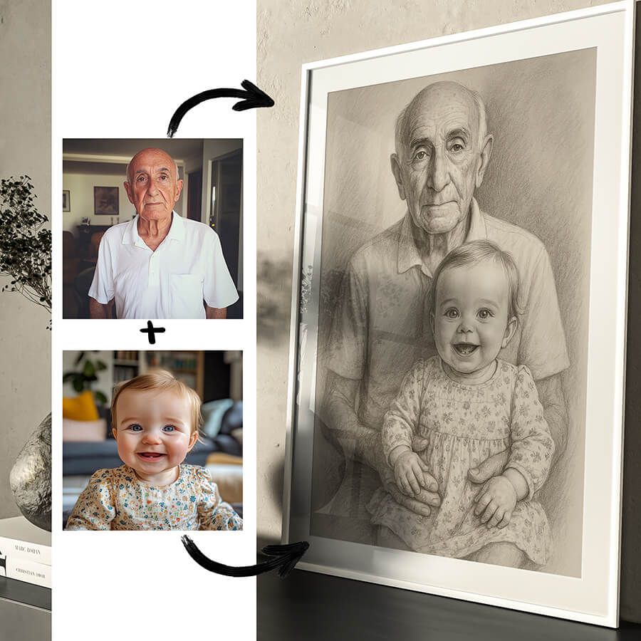 Ein einzigartiges Gedenkposter, das geliebte Menschen wieder vereint – auch über den Tod hinaus. Aus zwei oder mehreren Fotos erstellen wir ein gemeinsames, liebevoll gezeichnetes Porträt, z. B. von einem Großvater und einem Enkelkind. Dieses emotionale Kunstwerk eignet sich perfekt als Geschenk zum Muttertag, Vatertag oder als Erinnerungsstück für jemanden, der einen geliebten Menschen verloren hat. Eine wunderschöne Art, Nähe, Liebe und Erinnerung auf ewig festzuhalten.