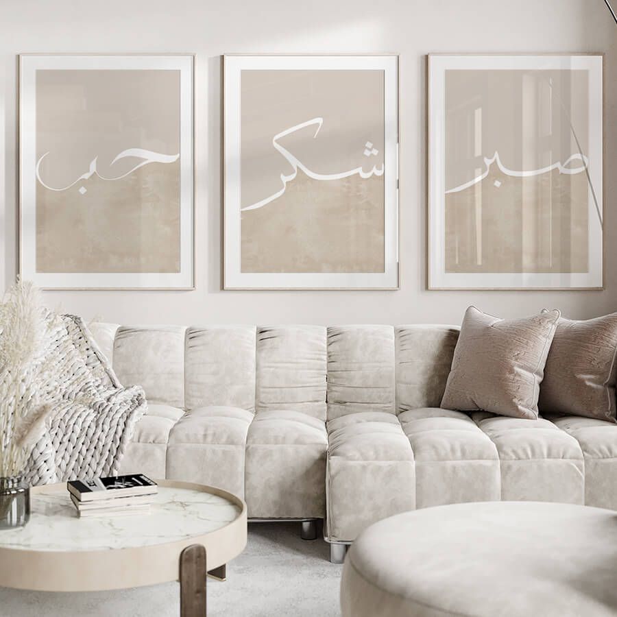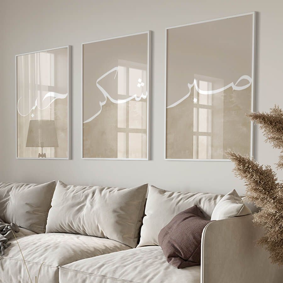 Mit seiner stilvollen arabischen Kalligrafie und minimalistischen Ästhetik ist dieses Set ideal für designbewusste Kunden, die Bedeutung und Ästhetik in ihren Wohnräumen vereinen möchten. Diese Drucke sind nicht nur Dekoration, sondern auch eine stetige Erinnerung an die Werte, die unser Leben leiten.