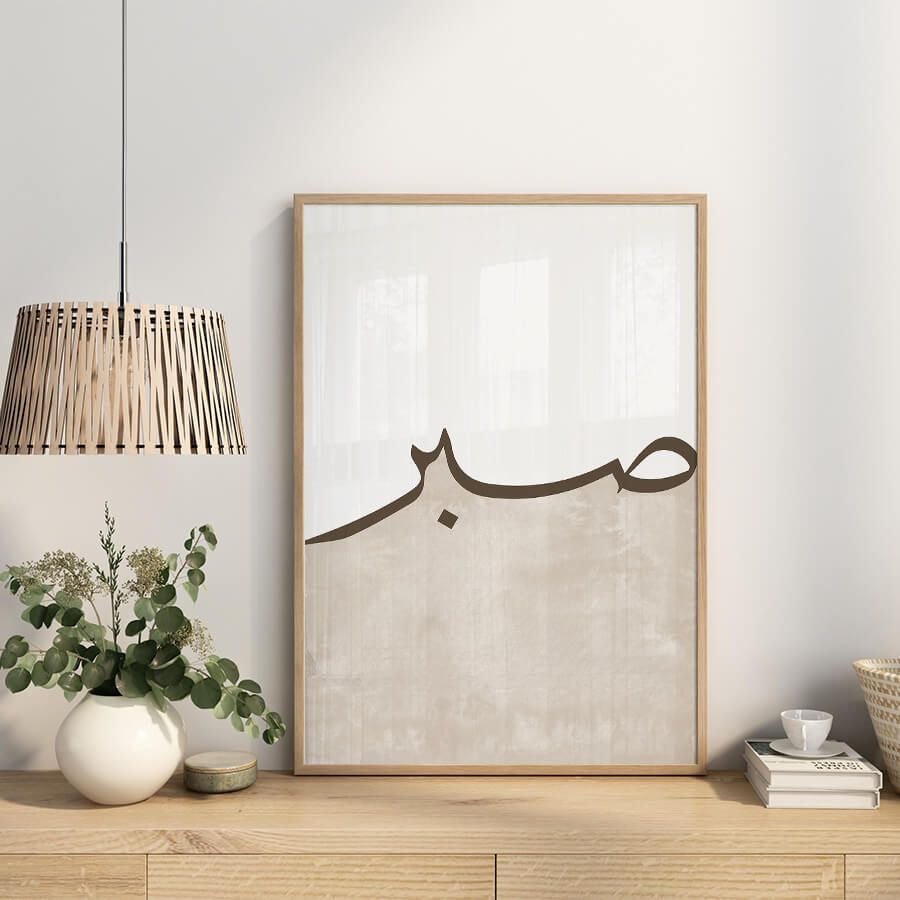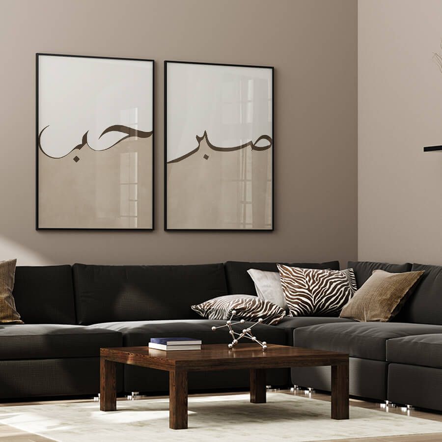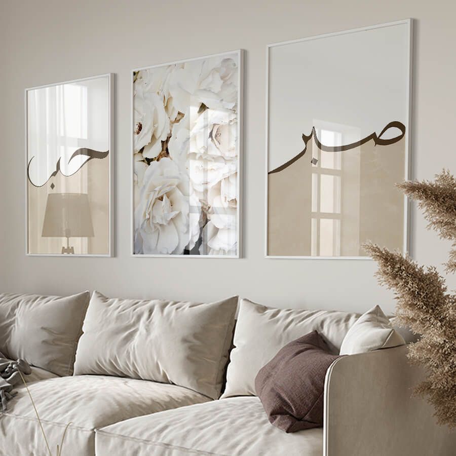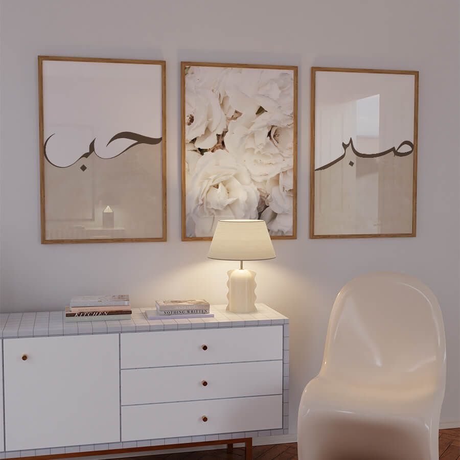 Der Love [hub حب], Roses, Patience [Sabr صبر] Poster Set von at9pm ist mehr als nur Dekoration – er ist ein Ausdruck tief verwurzelter Werte und ästhetischer Sensibilität. Diese exquisite Sammlung verbindet elegante Schriftzüge in arabischer Kalligrafie mit der zeitlosen Schönheit von Rosen und der Botschaft von Geduld.