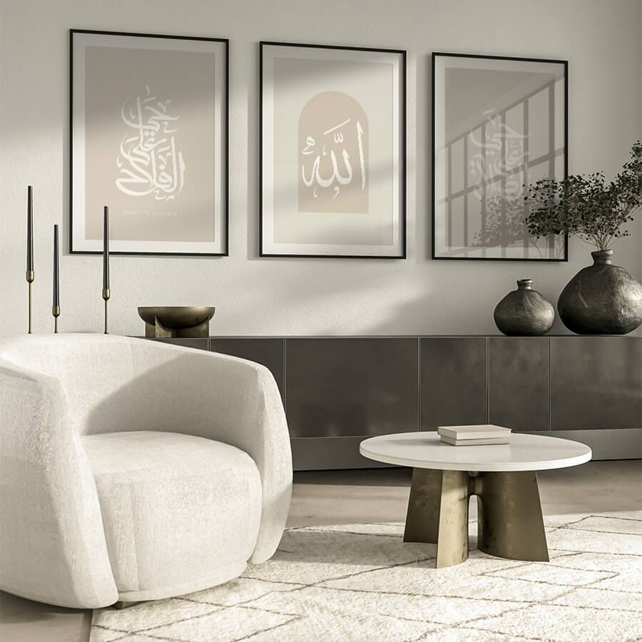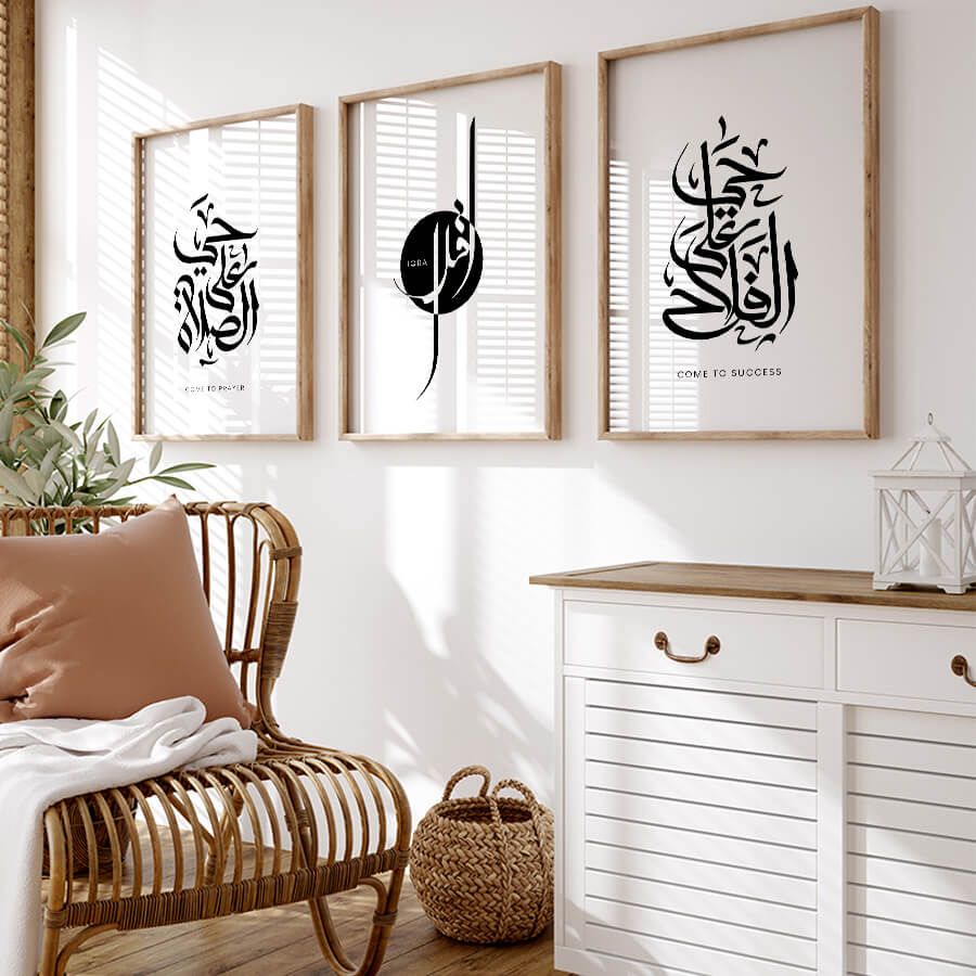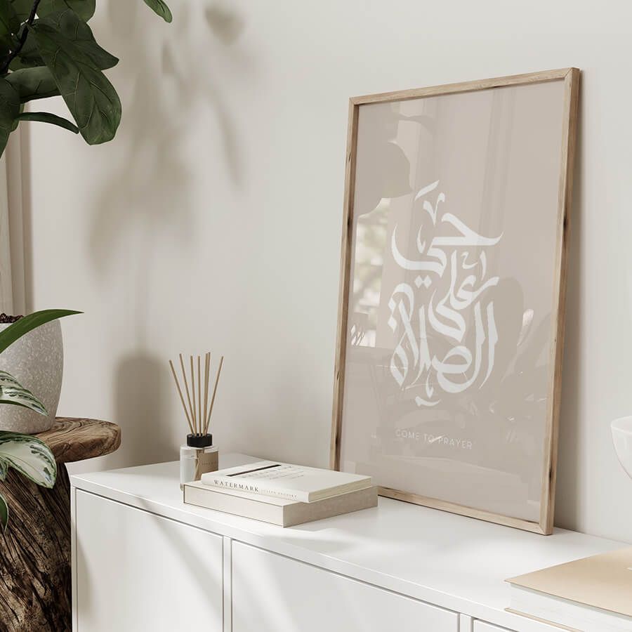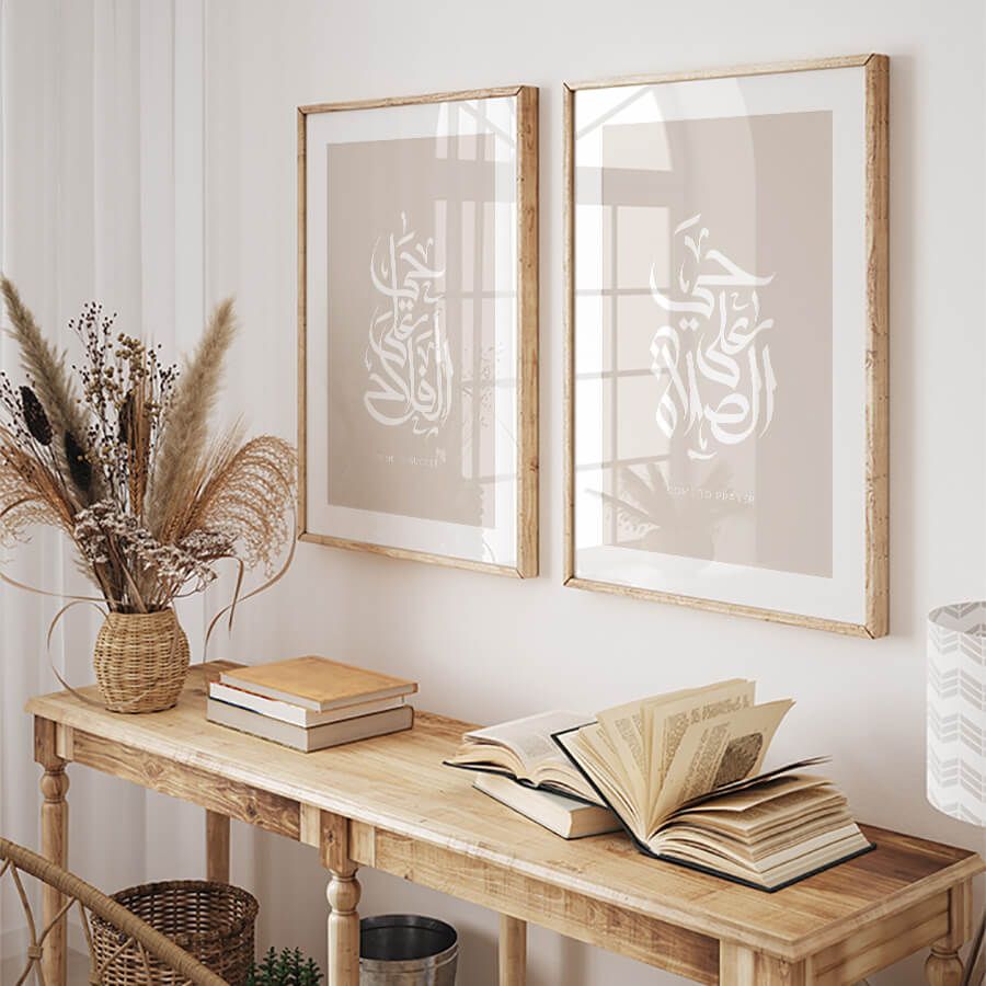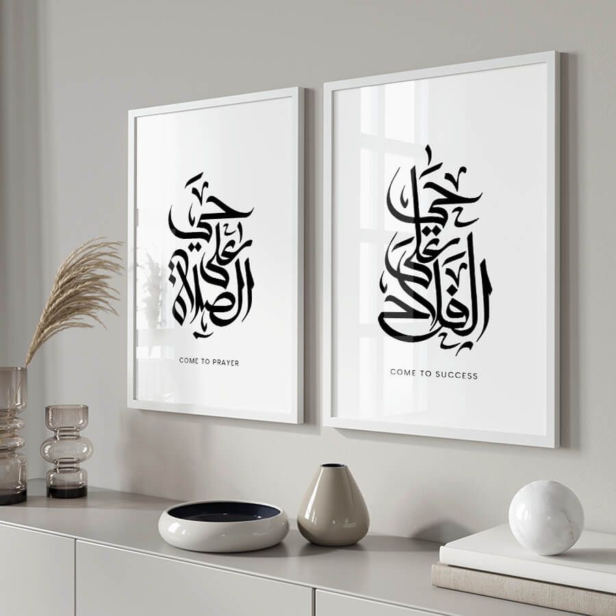 Verleihen Sie Ihrem Wohnraum eine ergreifende spirituelle Note mit diesem exklusiven Poster-Set von at9pm. Die beiden kunstvoll gestalteten Drucke, die die tiefsinnigen Aufrufe „Hayya 'Ala-s-Salah“ (kommt zum Gebet) und „Hayya 'Ala-l-Falah“ (kommt zum Erfolg) darstellen, sind mehr als nur Dekoration; sie sind ein Ausdruck Ihrer kulturellen Identität und Ihres Glaubens.