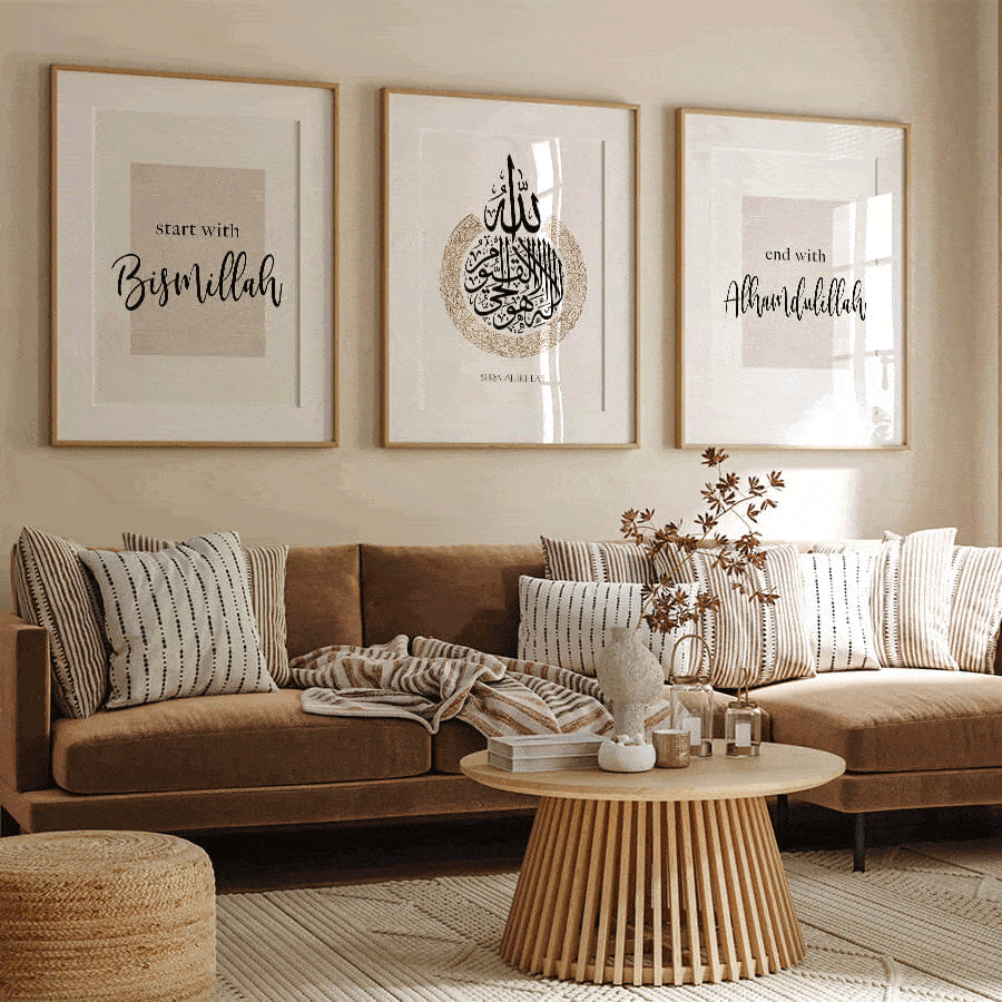 Erleben Sie die harmonische Verbindung von Kunst und Spiritualität mit unserem exquisiten "Start with Bismillah, End with Alhamdulillah" Poster Set von at9pm. Diese sorgfältig gestalteten Wandbilder sind mehr als nur Dekoration; sie sind Ausdruck eines tiefen Verständnisses für die Schönheit des islamischen Glaubens und der arabischen Kultur.
