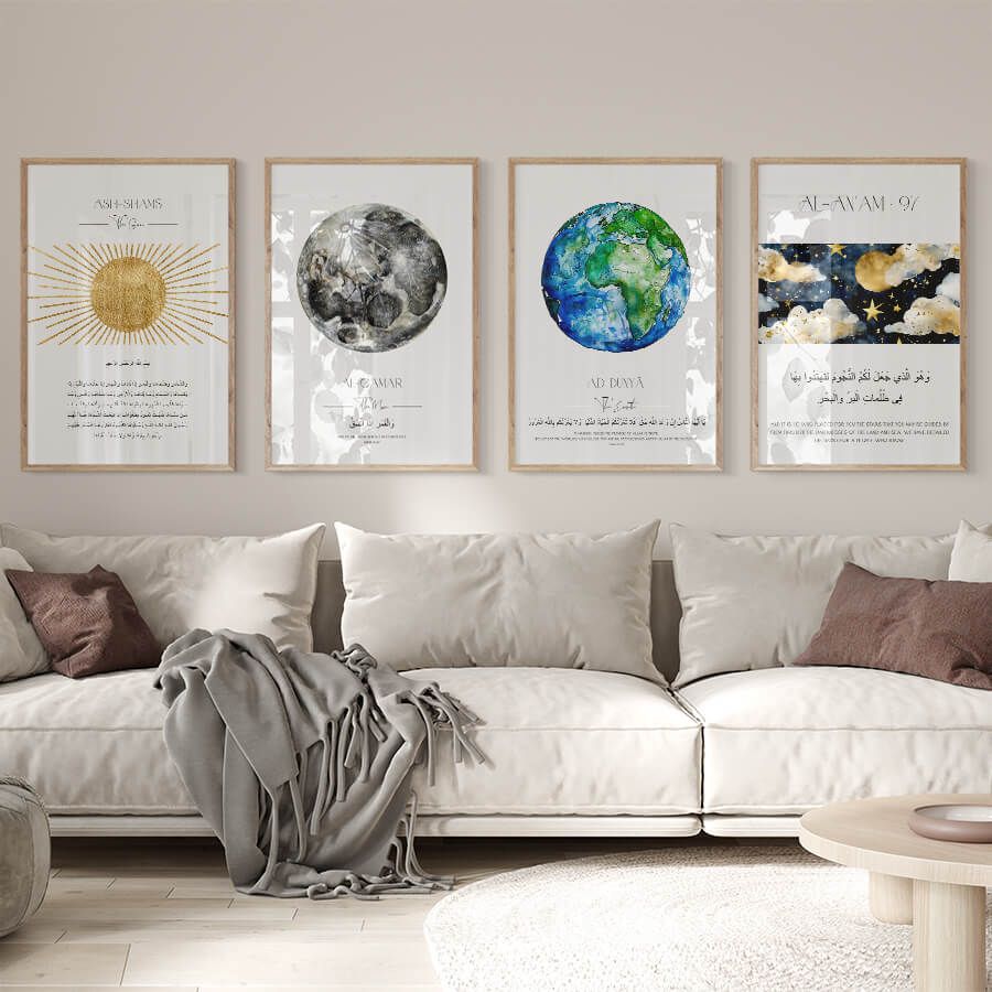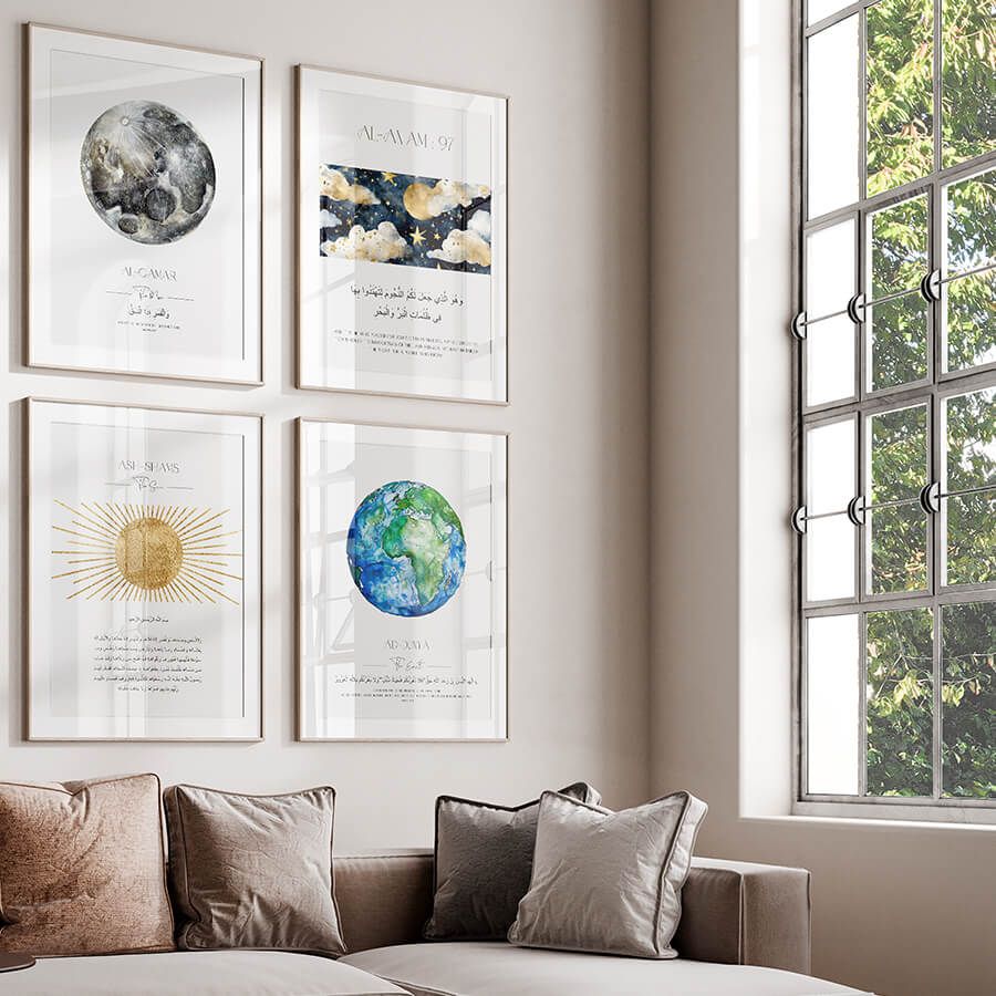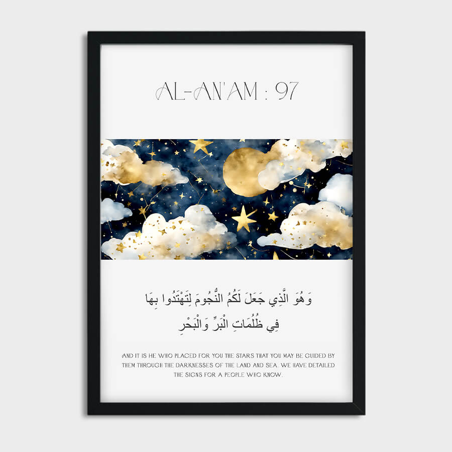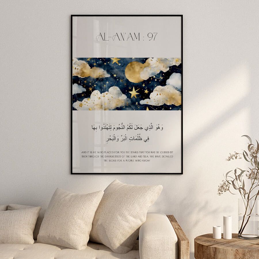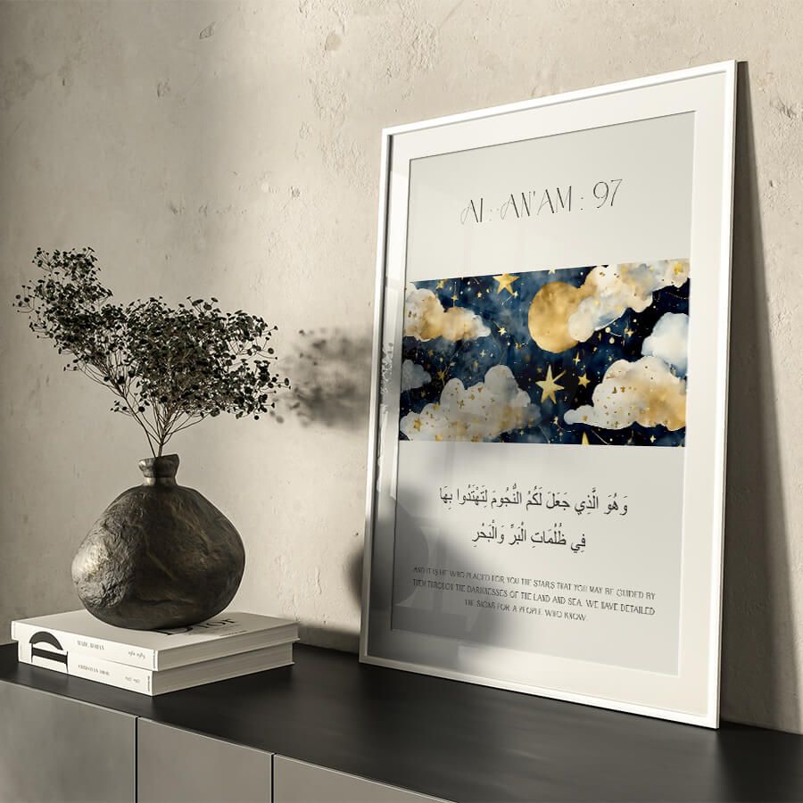 Das Poster mit dem Qurʾan-Vers aus Sure Al-An'am (Vers 97) verkörpert eine harmonische Verschmelzung von spiritueller Tiefe und künstlerischem Design. Dieser Vers öffnet ein Fenster zur Reflexion über das Universum und die Zeichen Gottes, indem er den Betrachter dazu einlädt, die funkelnden Sterne als Ausdruck seiner Allmacht zu sehen.