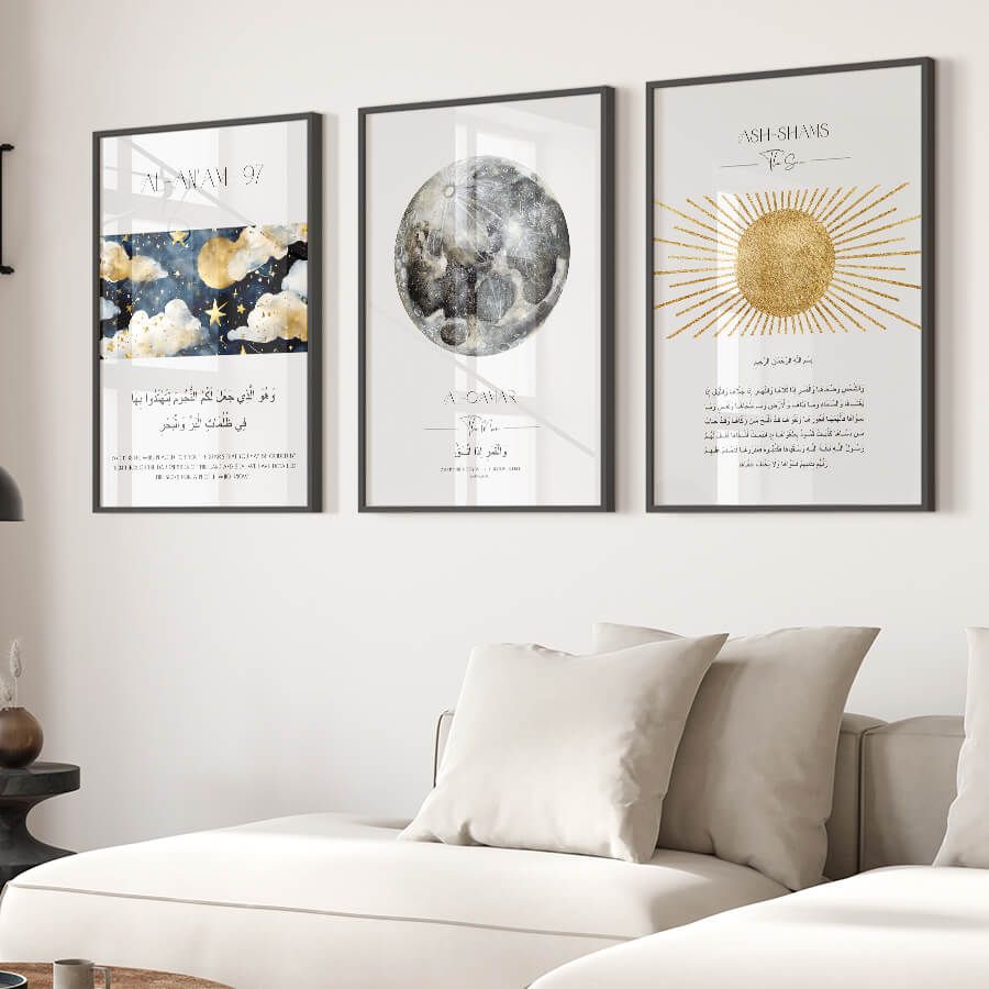 Die filigrane arabische Kalligrafie überträgt die Worte des heiligen Textes in einer Ästhetik, die sowohl modern als auch traditionell ist. Sie wird in jeder Umgebung zu einem Ruhepol, der die Seele und den Geist nährt. Diese Wandkunst ist für designbewusste Menschen geschaffen, die Schönheit und Bedeutung in ihrem Zuhause vereinen möchten.