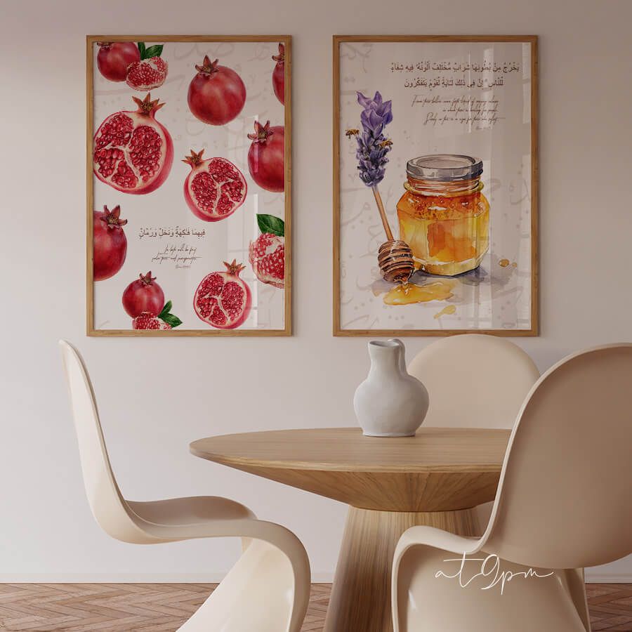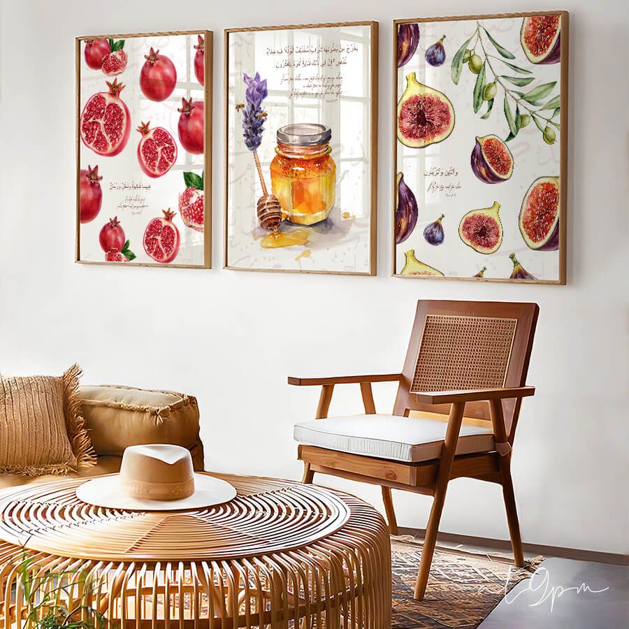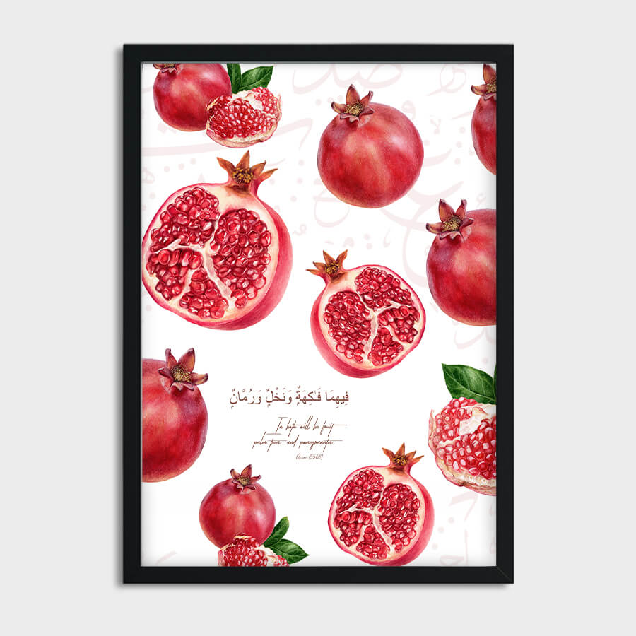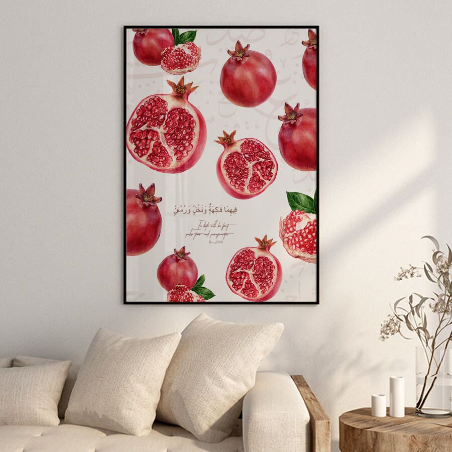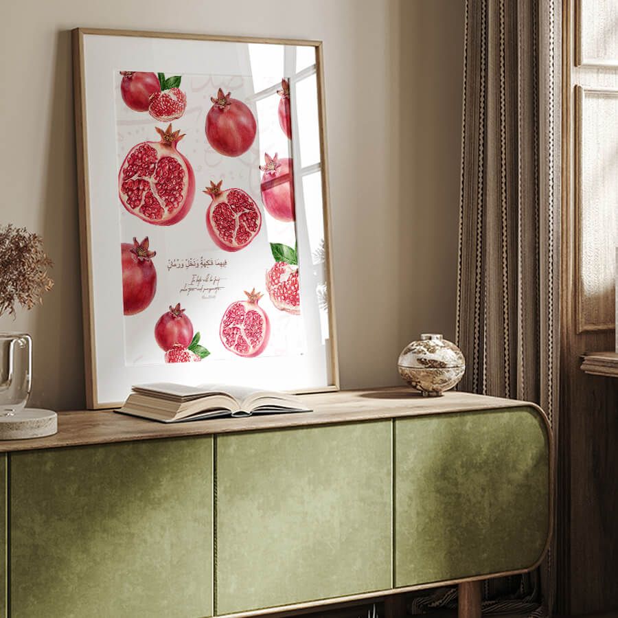 Poster mit Qurʾan-Vers – Sure Ar-Rahman (Vers 68) | Paradiesische Gaben mit Granatäpfeln | Islamische Wandkunst