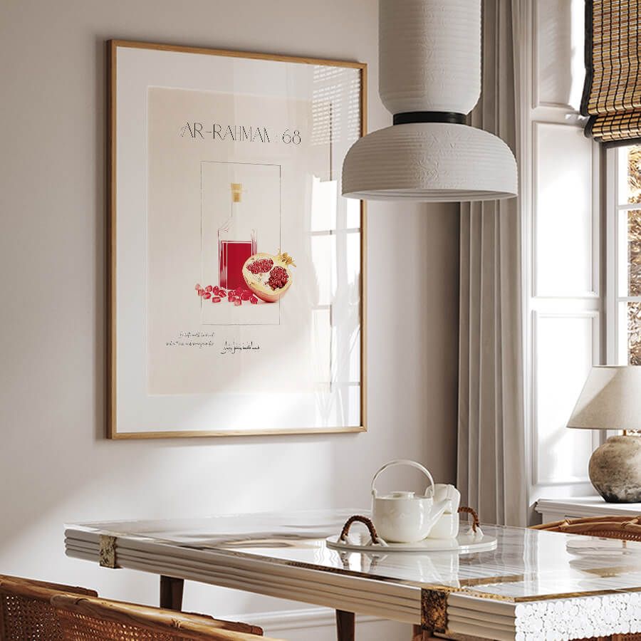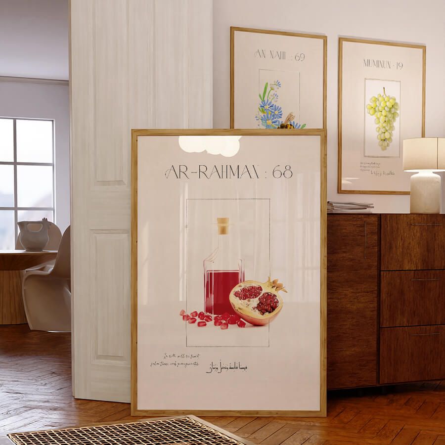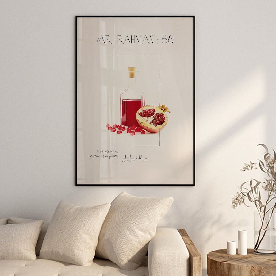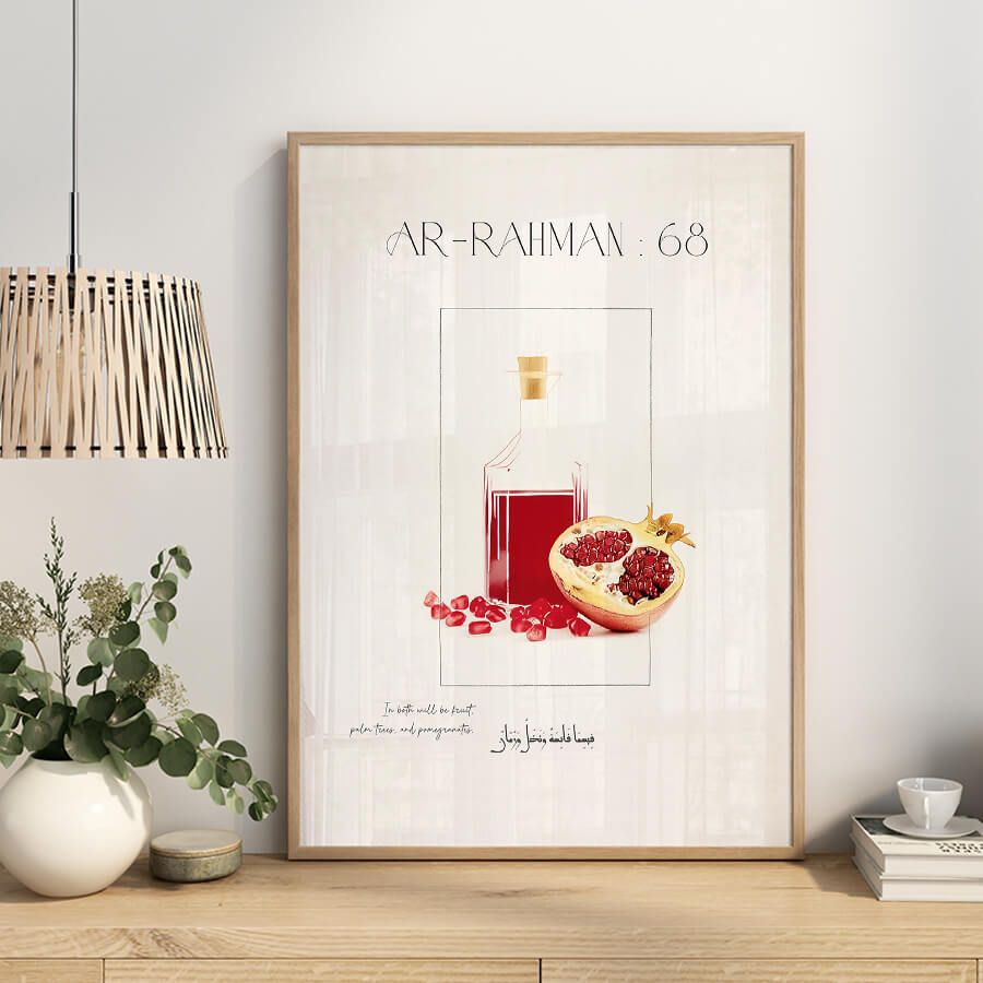 Poster mit Qurʾan-Vers – Sure Ar-Rahman (Vers 68) | Paradiesische Gaben mit Granatäpfeln | Islamische Wandkunst