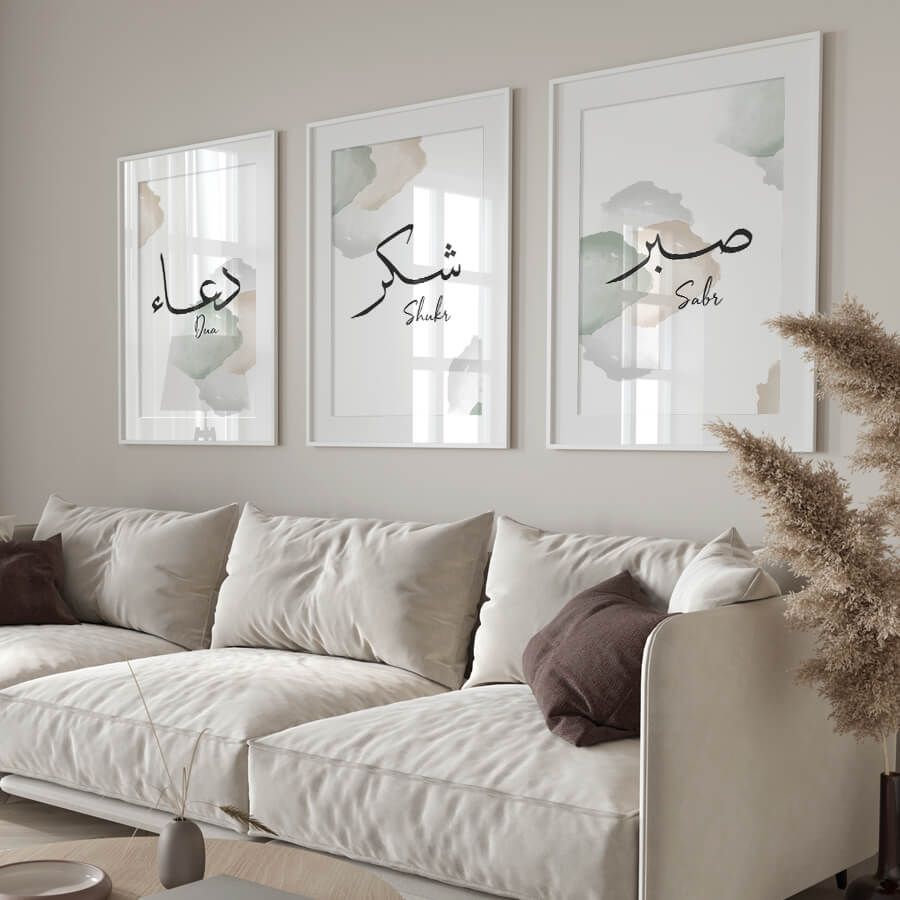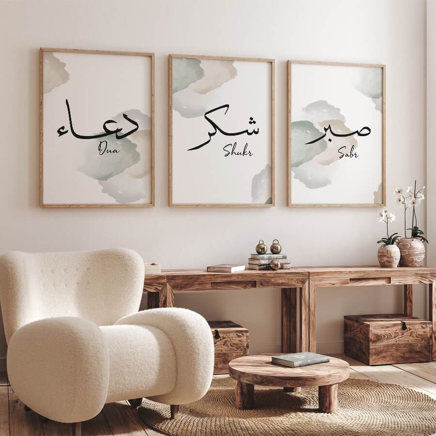 Each poster features elegant Arabic calligraphy, embodying concepts that resonate deeply within the soul. “Dua [دعاء]” represents supplication, a heartfelt communication with the Divine. “Shukr [شكر]” signifies gratitude, a reminder to acknowledge the blessings in our lives. “Sabr [صبر]” stands for patience, an enduring strength that guides us through trials and tribulations. Together, these words create a harmonious space that encourages reflection and mindfulness.