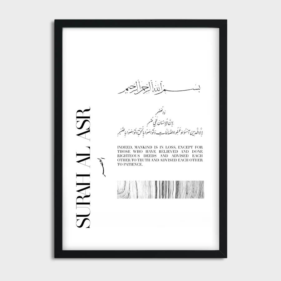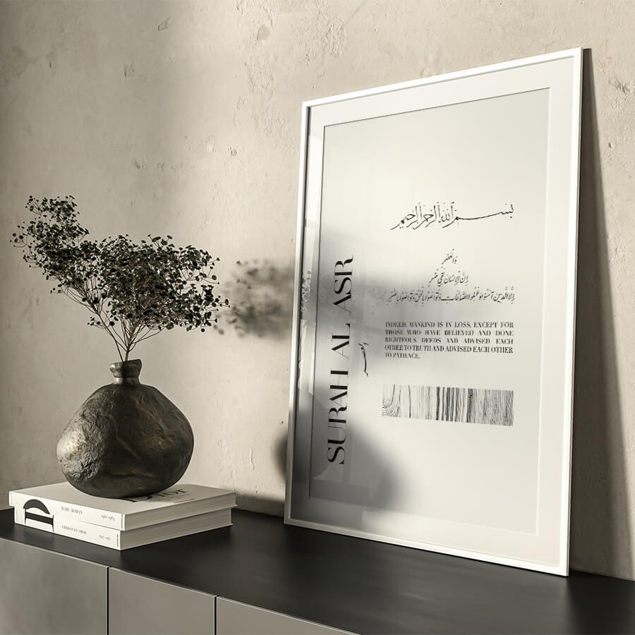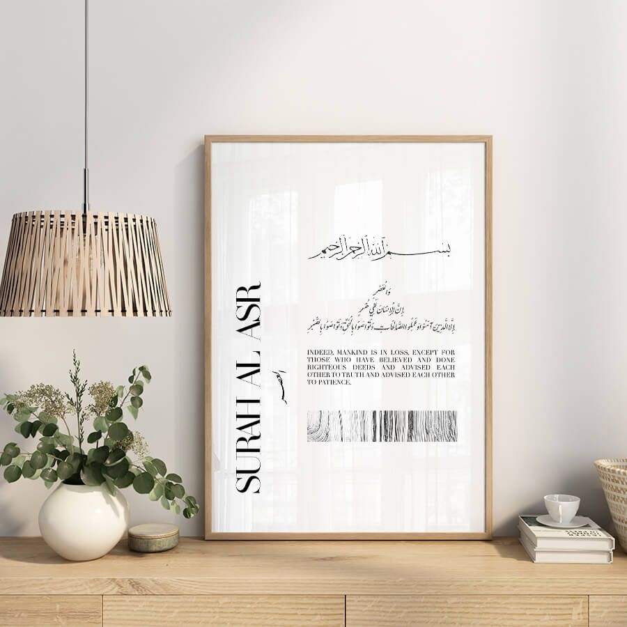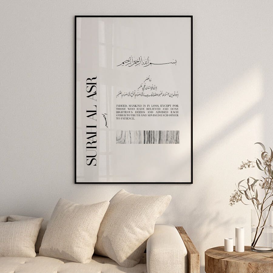 Invite serenity and reflection into your space with the Surah Al-Asr Poster from at9pm. This exquisite piece of Islamic wall art captures the essence of timeless wisdom and tranquil design, making it a perfect addition for those who appreciate both faith and aesthetics.