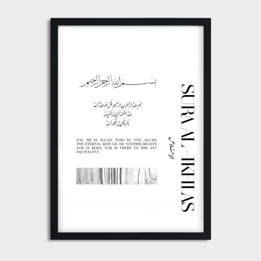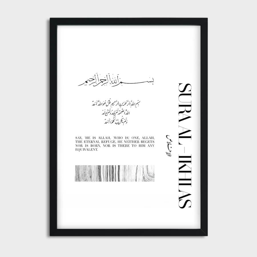 Introducing the Surah Ikhlas Poster, a refined expression of faith and artistry that seamlessly merges spirituality with sophisticated design. Captured in elegant Arabic calligraphy, this piece epitomizes the essence of devotion and oneness with the Divine, offering a serene ambiance to any space it graces.