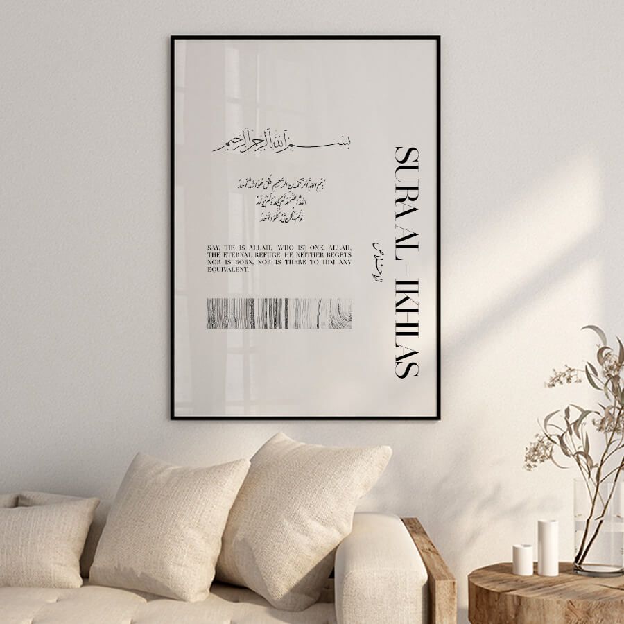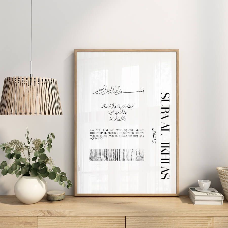 The Surah Ikhlas Poster is not merely a decoration; it is a thoughtful representation of culture and belief, intended for those who appreciate the artistry of a curated design object. Embrace the harmony of spirituality and style within your interiors, and allow this exquisite piece to inspire both you and your guests.
