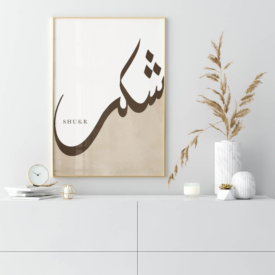 Crafted with an eye for design-savvy customers, this piece features the Arabic word "Shukr," meaning "gratitude." It invites reflection on the beauty of being grateful—a core principle in Islamic teachings. The flowing calligraphy embodies a sense of tranquility, enhancing any space with its refined aesthetic.