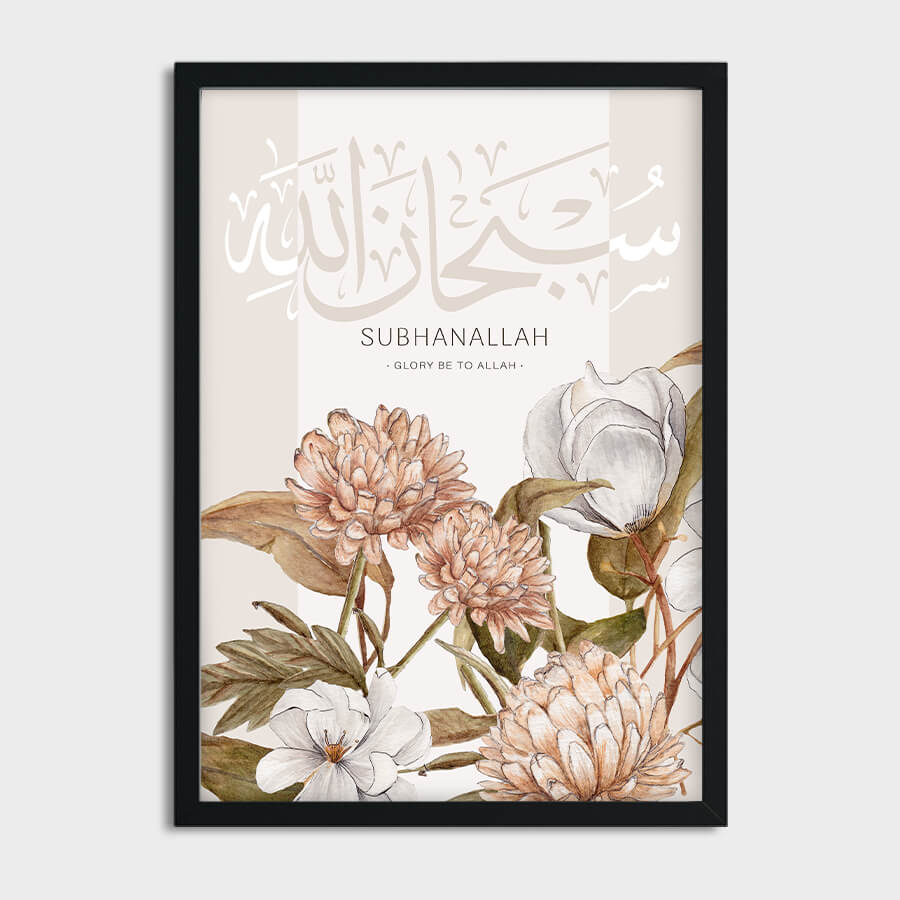 Immerse yourself in a serene atmosphere with our Subhanallah Poster by at9pm, a curated piece of Islamic wall art that transcends the ordinary. "Subhanallah," which translates to "Glory be to Allah," is a heartfelt expression of reverence that resonates deeply within the soul. This poster not only encapsulates this profound sentiment but does so through exquisite design, presented in elegant Arabic calligraphy that dances across the canvas.