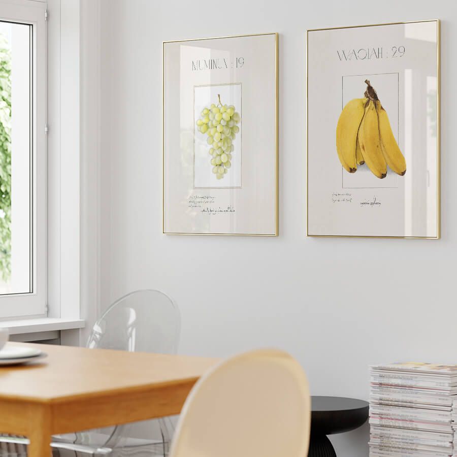 Embrace the tranquility of divine insight with our exquisite Quran Verse Poster, featuring Surah Al-Waqi'ah, Verse 29, elegantly adorned with symbols of banana trees. This piece is not merely wall decor; it is a thoughtful expression of faith and artistry designed for those who appreciate the beauty of personalized, curated design objects.