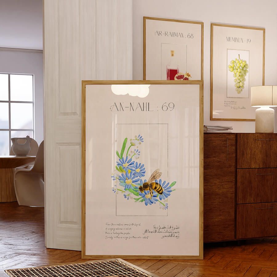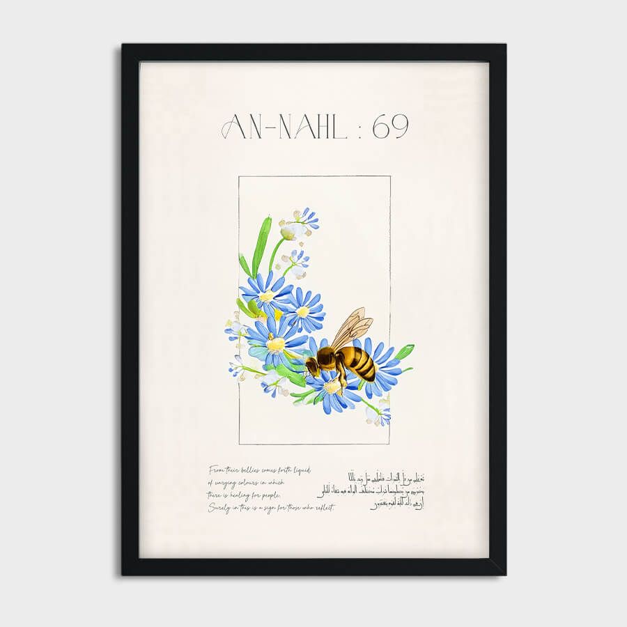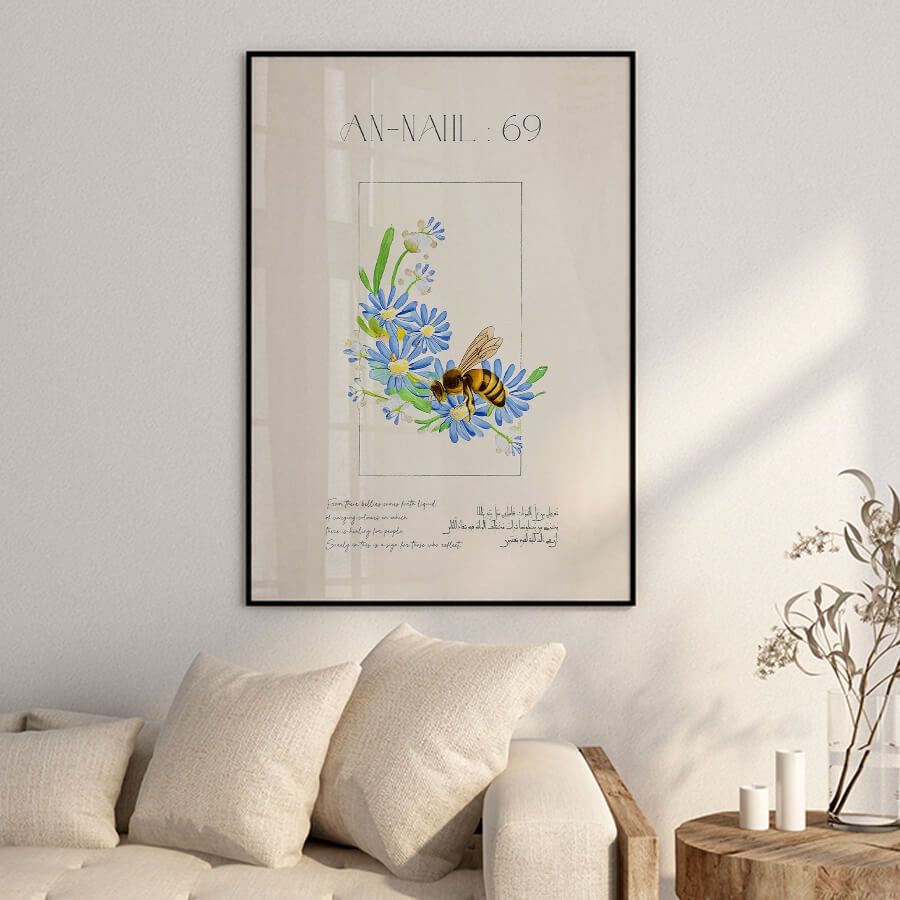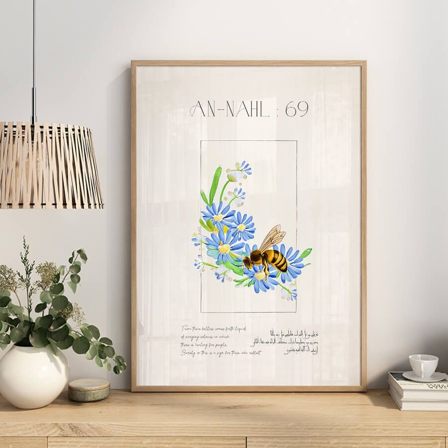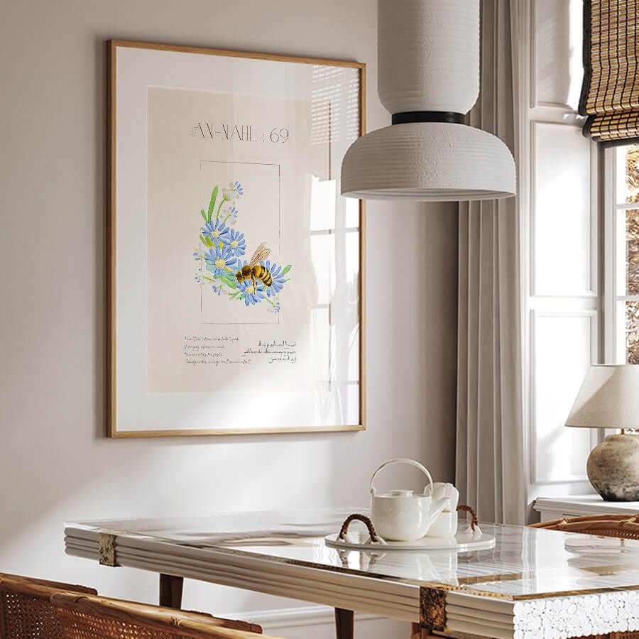 Enhance your space with the Quran Verse Poster – Surah An-Nahl (Verse 69), a sublime piece of Islamic wall art that combines spiritual depth with refined aesthetics. This elegantly curated design captures the essence of divine wisdom, beautifully illustrating the significance of honey, a symbol of nourishment and sweetness in life.