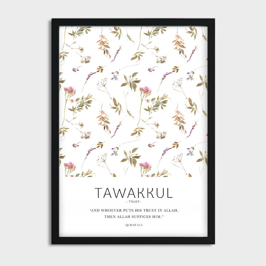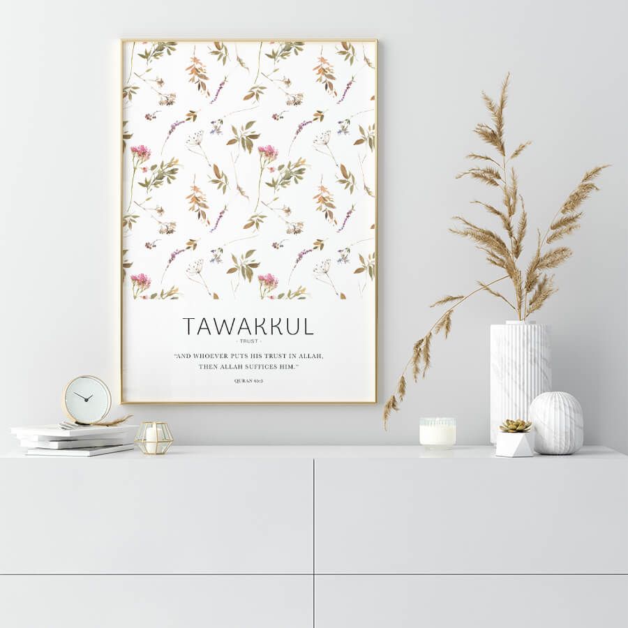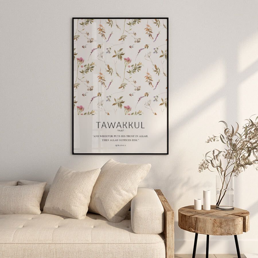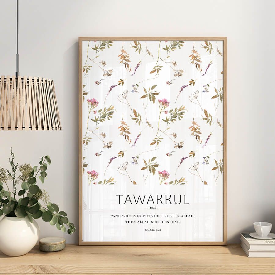 Invite serenity and faith into your living space with the exquisite "Tawakkul توكل [Trust], Quran 65:3 Poster" from at9pm. This premium piece of Islamic wall art encapsulates the profound concept of trust in Allah, drawing upon the timeless wisdom of the Quran. The Arabic word "Tawakkul," meaning trust or reliance, reminds us to surrender our worries and embrace faith with calm conviction.