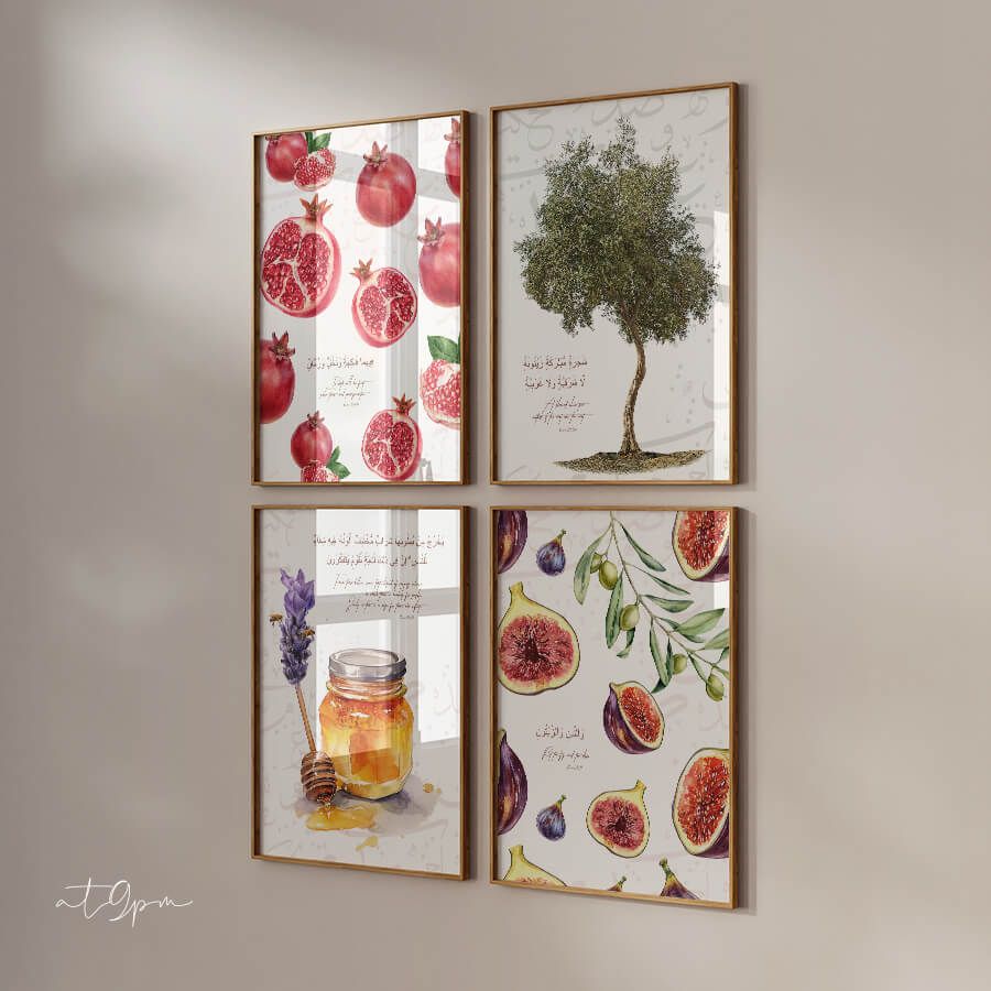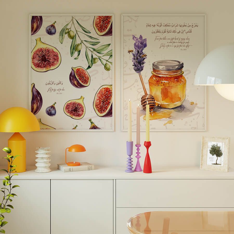 Découvrez une œuvre d'art murale exceptionnelle qui célèbre les symboles profonds de la culture islamique. La figue et l'olive, mentionnées dans la Sourate At-Tin, évoquent non seulement la richesse de la nature, mais aussi l'esprit de paix et de prospérité que ces éléments représentent dans la tradition coranique.